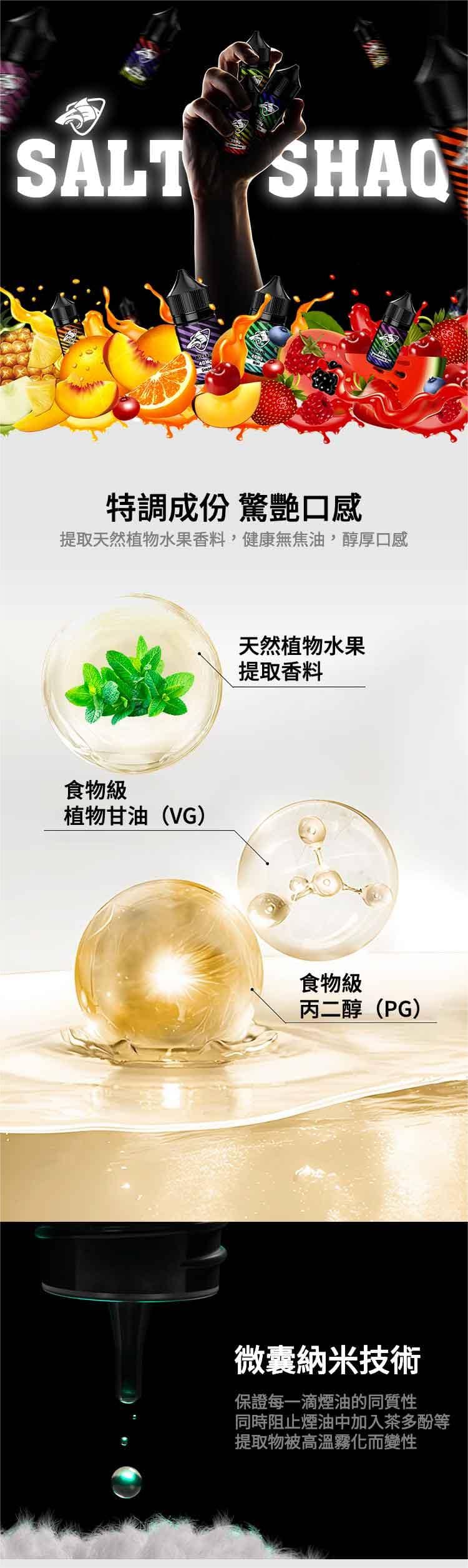 主要成分:美國進口FDA認證食品級植物甘油,丙二醇,尼古丁鹽,天然食品級香料(低溫冷萃提取),苯甲酸(降低菸氣鹼性,降低喉嚨刺激)
